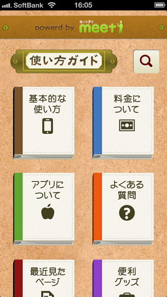 使い方ガイドfor iPhoneを起動すると、本のアイコンが並ぶメインメニュー「基本的な使い方」「アプリについて」「最近見たページ」「料金について」「よくある質問」「便利グッズ」が表示されます。iPhoneを使い始めたばかりの人は、まず「基本的な使い方」をチェックしましょう。メールの送り方や音楽の再生方法、インターネットへの接続方法、写真の撮影方法などが詳しく説明されています。また、「自分の電話番号を知りたい」など「基本の基本」的な疑問がある場合は、「よくある質問」の中の項目「基本操作」を参照しましょう。